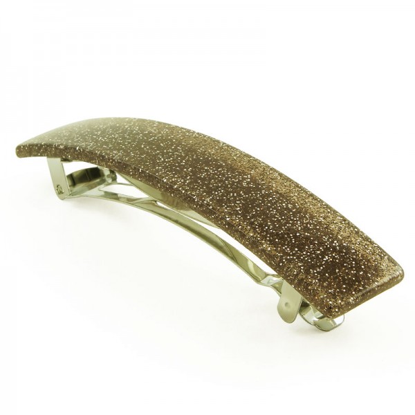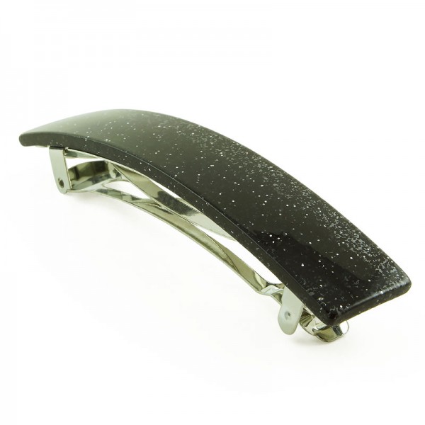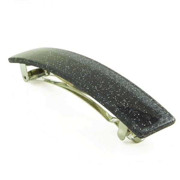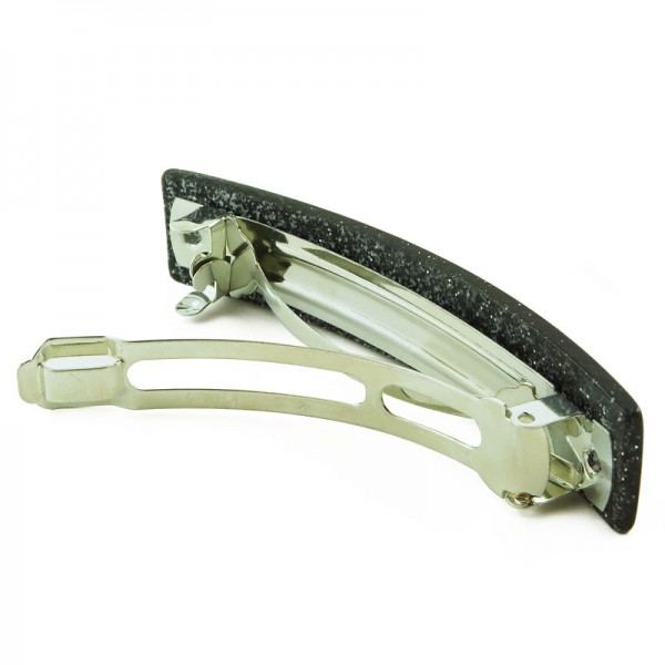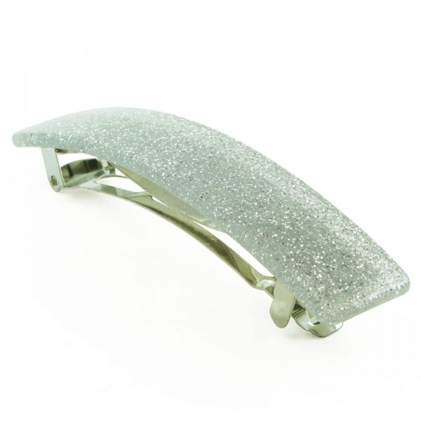 Hårspänne med rektangelformad akrylplatta på ovansidan. Plattan är transparent och enfärgad med inslag av vitt glitter. På undersidan sitter ett kraftigt metallspänne som klarar både tunt och tjockt hår.