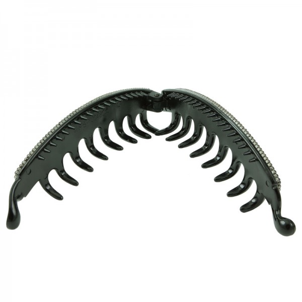 Vår största och kanske även vår vackraste bananklämma - en riktig kvalitetsaccessoar. Förutom att modellen är ovanlig så är båda sidorna dekorerade med likfärgade strasstenar. Bredden, där strasstenarna sitter, mäter 1,4 cm i bredd. Den totala bredden är 2,8 cm, längden 13,5 cm.