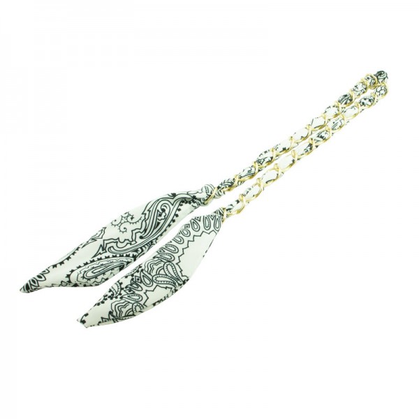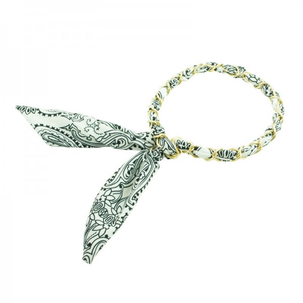Vit och blå bandana med abstrakt blommönster och en guldfärgad plastkedja runt om. Hela bandet går att forma som man vill då det ligger en böjbar ståltråd inuti bandet.