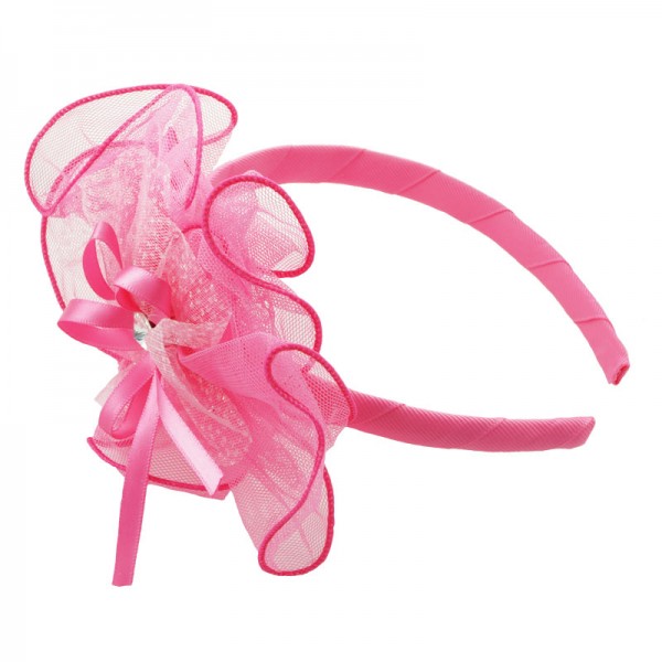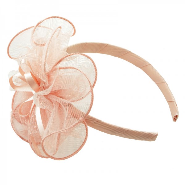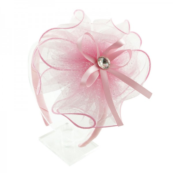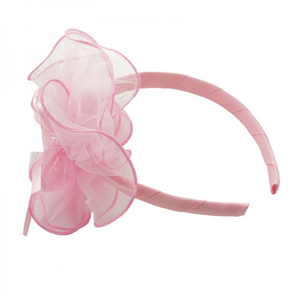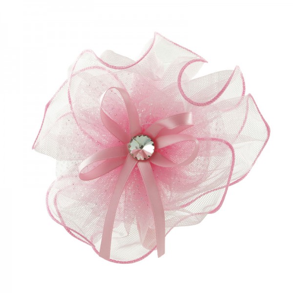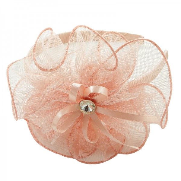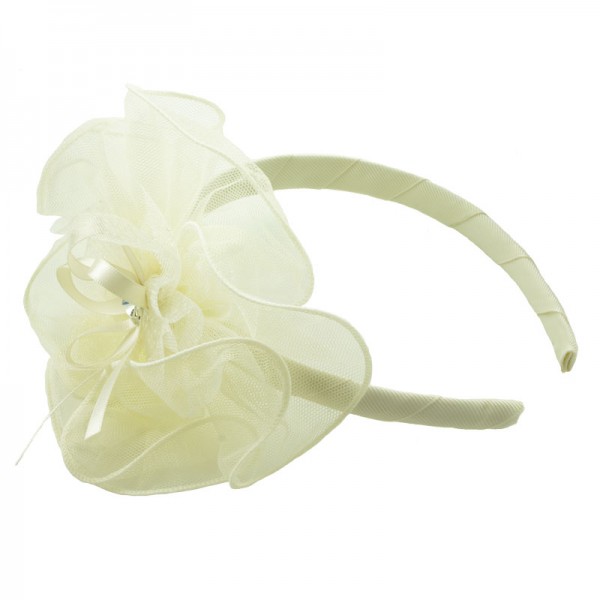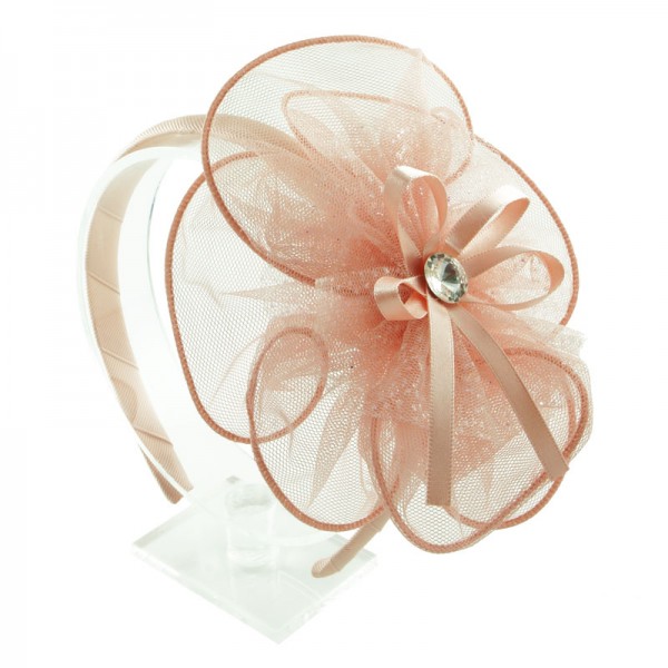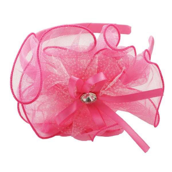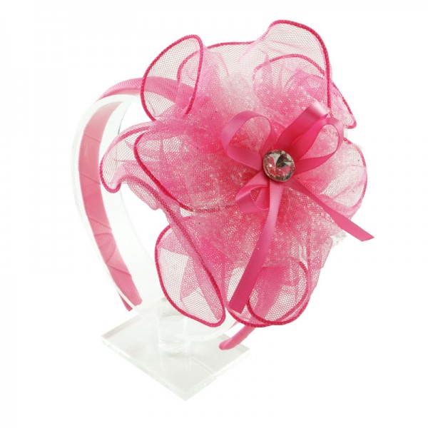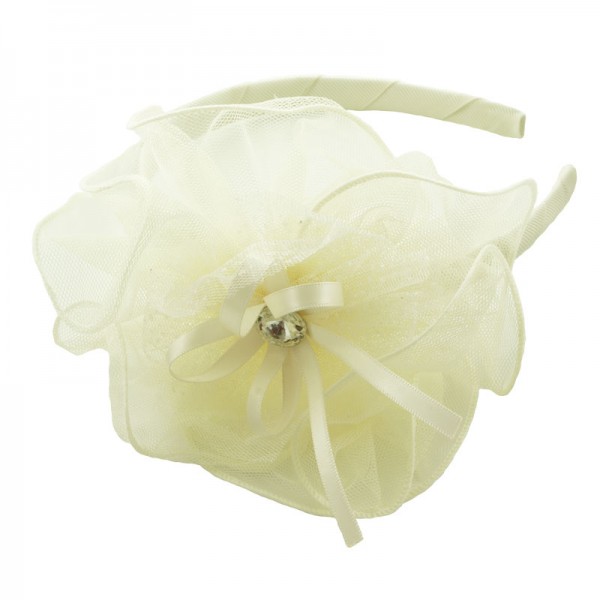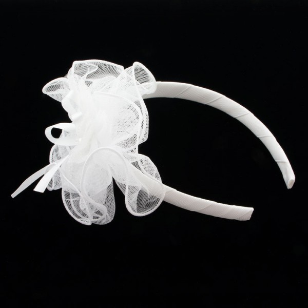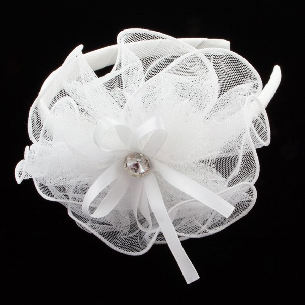 Diadem med en stor och finmaskig nätblomma på sidan. Blomman mäter 15 cm i diameter och är mycket välgjord med en rosett och vit glassten i mitten. På blomma sitter även ett vitt och glittrigt tyll tyg - en fin detalj som förhöjer intrycket.