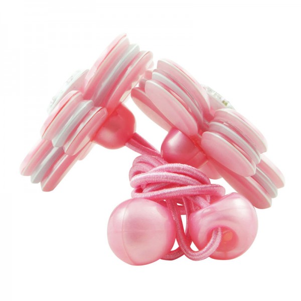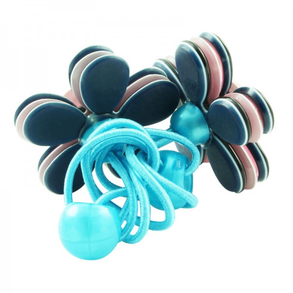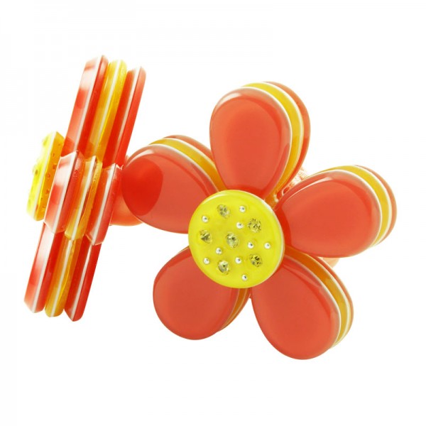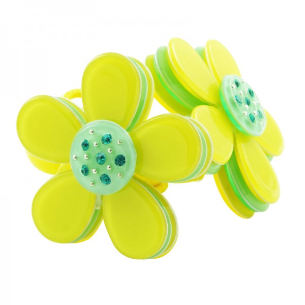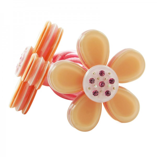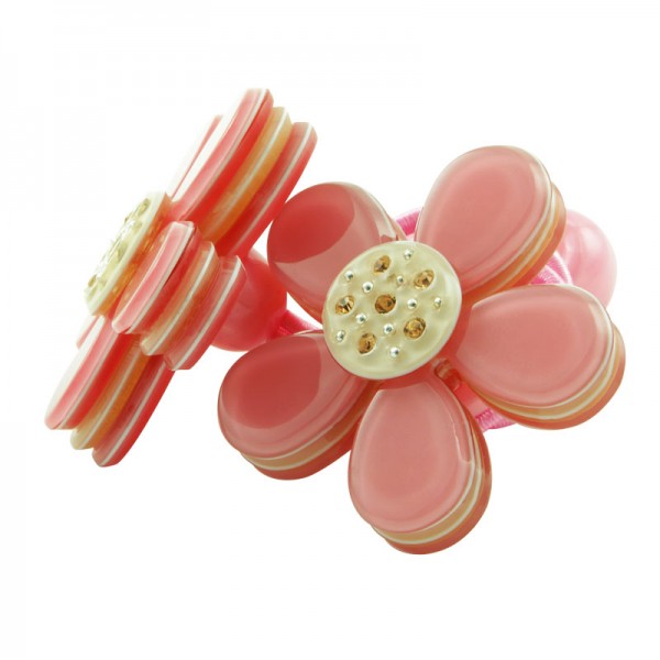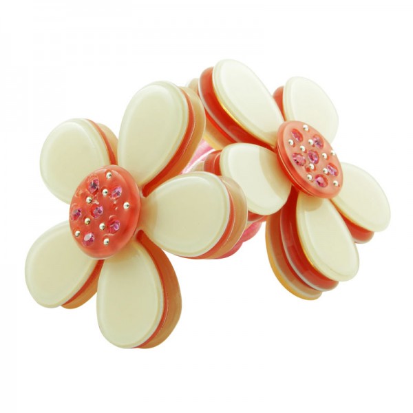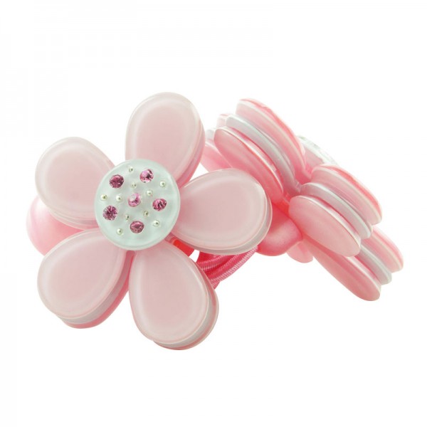Hårsnodd med stor blomma som mäter 3,5 cm i diameter med små glittriga stenar och silvriga nitar i mitten. Kronbladen har en blank yta och består av tre lager där mittendelen har en annan färg - ger blomman ett fint färgintryck.