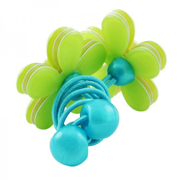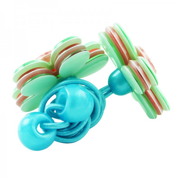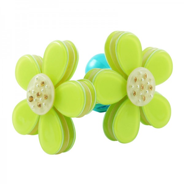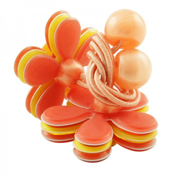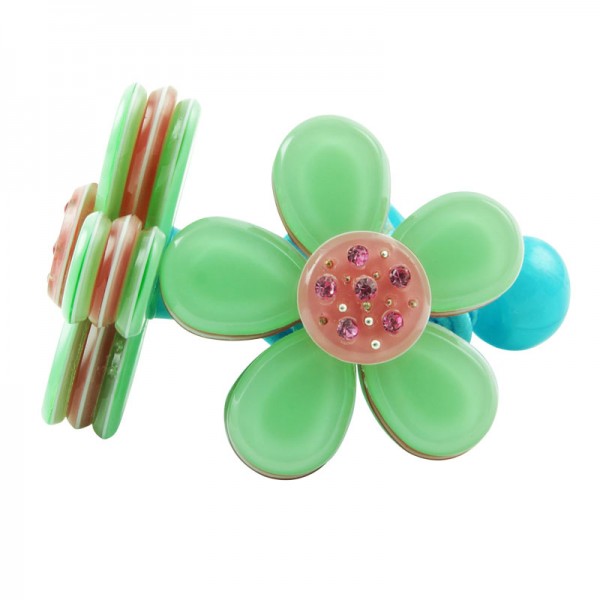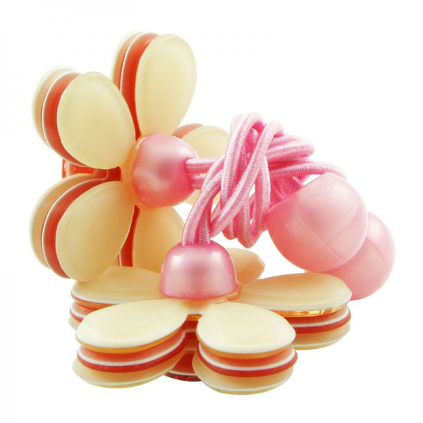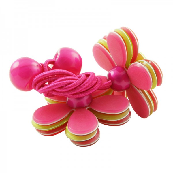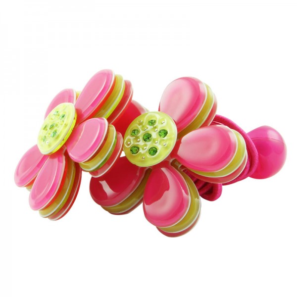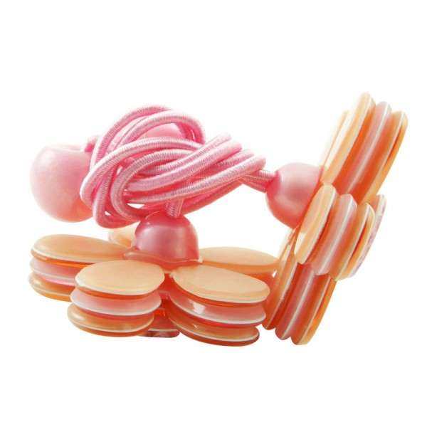 Hårsnodd med stor blomma som mäter 3,5 cm i diameter med små glittriga stenar och silvriga nitar i mitten. Kronbladen har en blank yta och består av tre lager där mittendelen har en annan färg - ger blomman ett fint färgintryck.