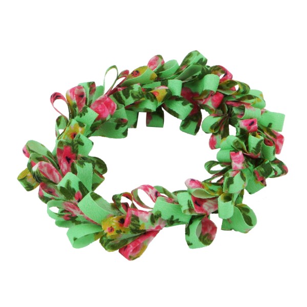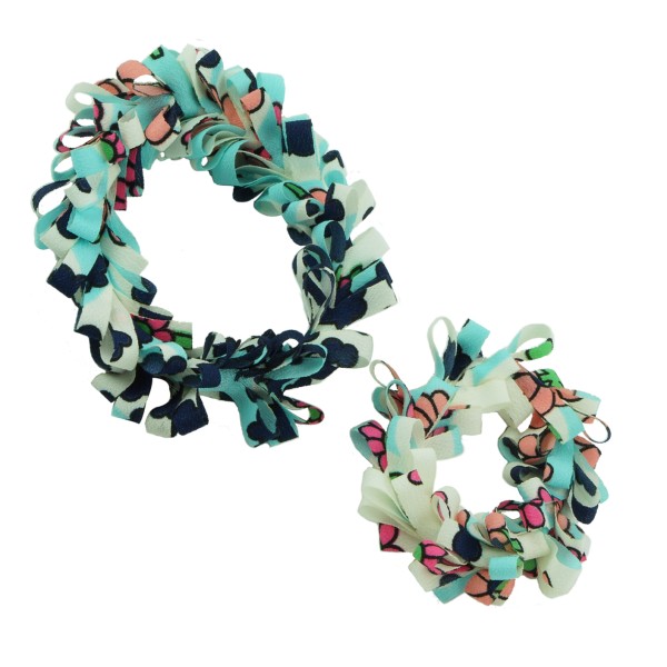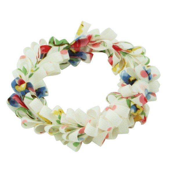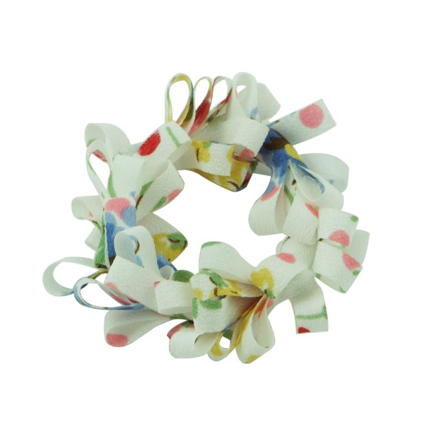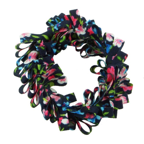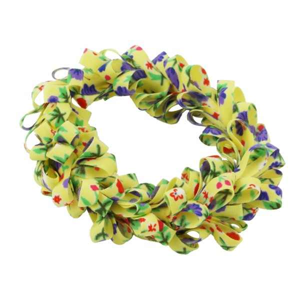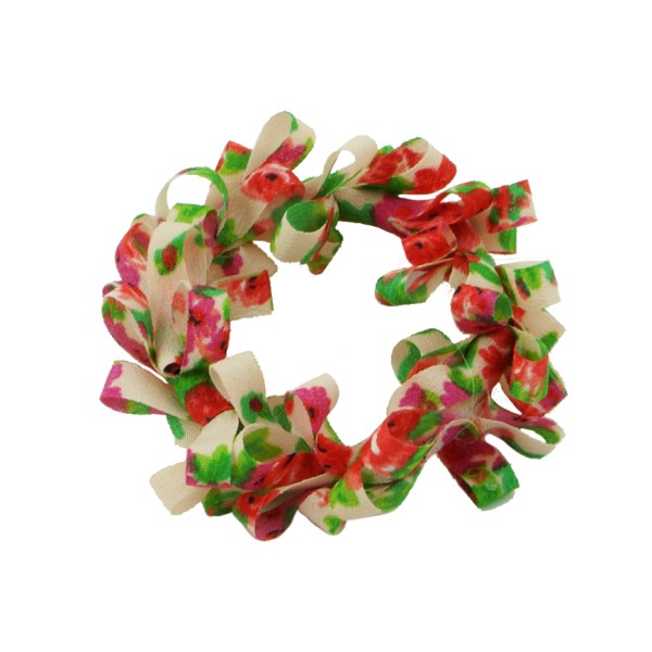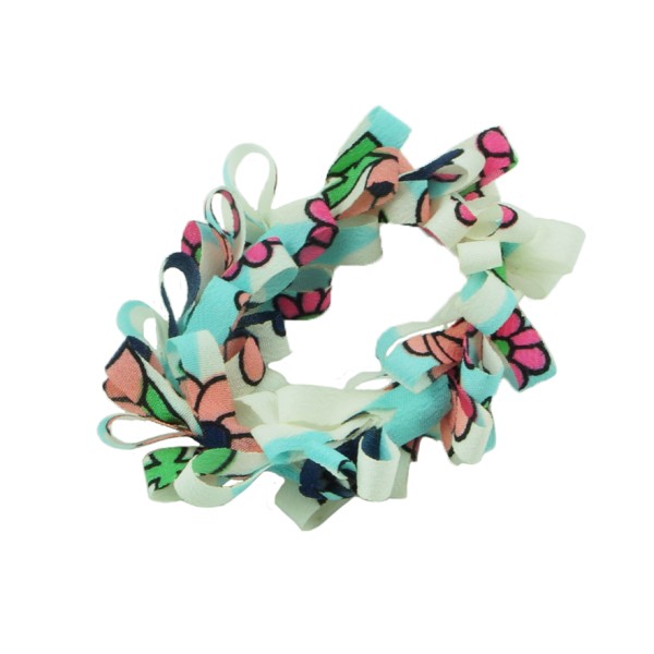 Handgjord hårsnodd med blommotiv och fransar. Tyget är av 100% polyester, slitstarkt och smutsavisande.