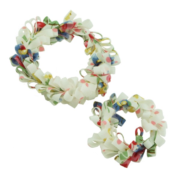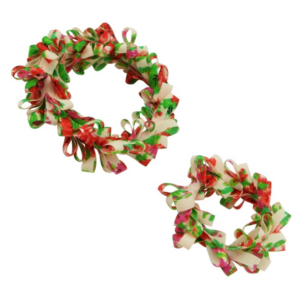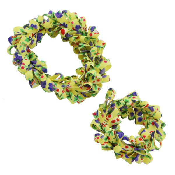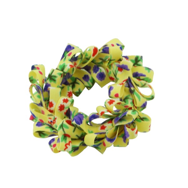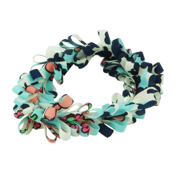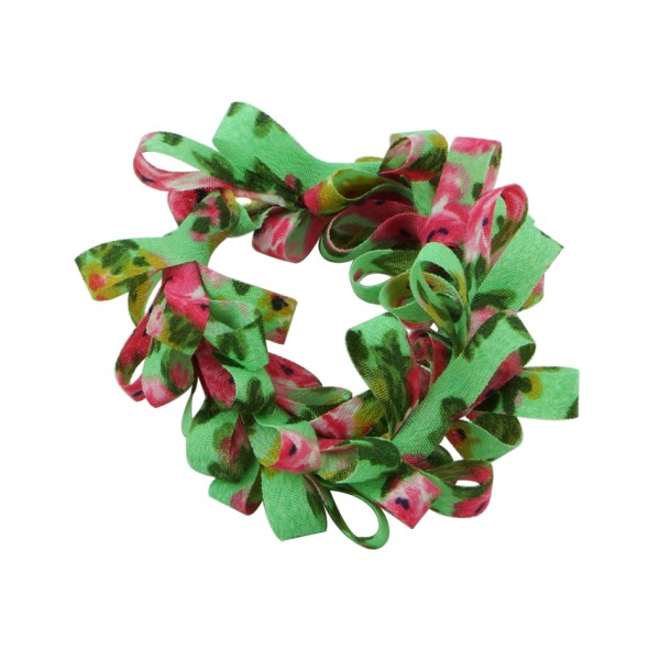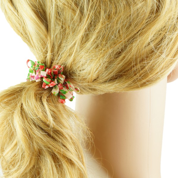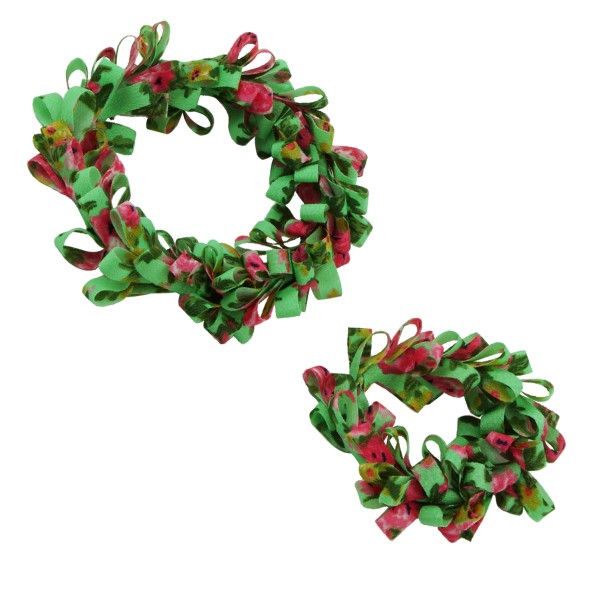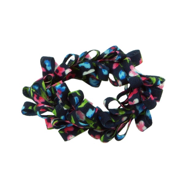 Handgjord hårsnodd med blommotiv och fransar. Tyget är av 100% polyester, slitstarkt och smutsavisande.