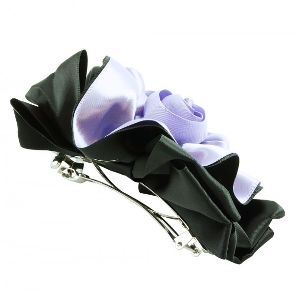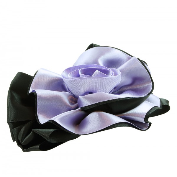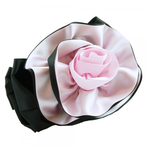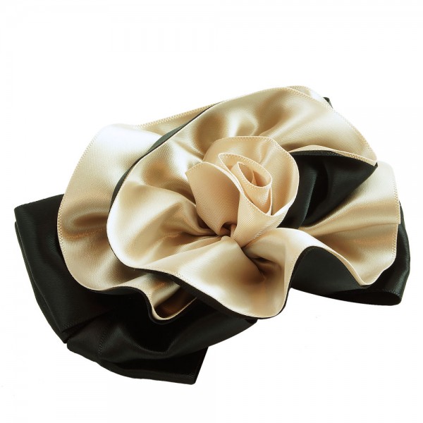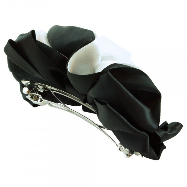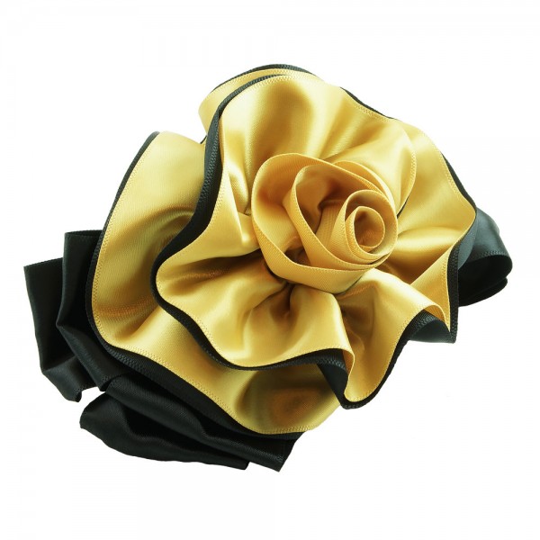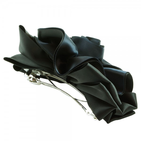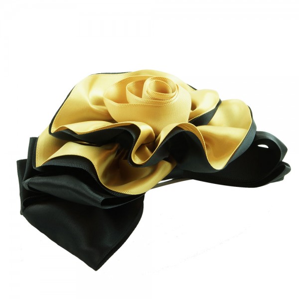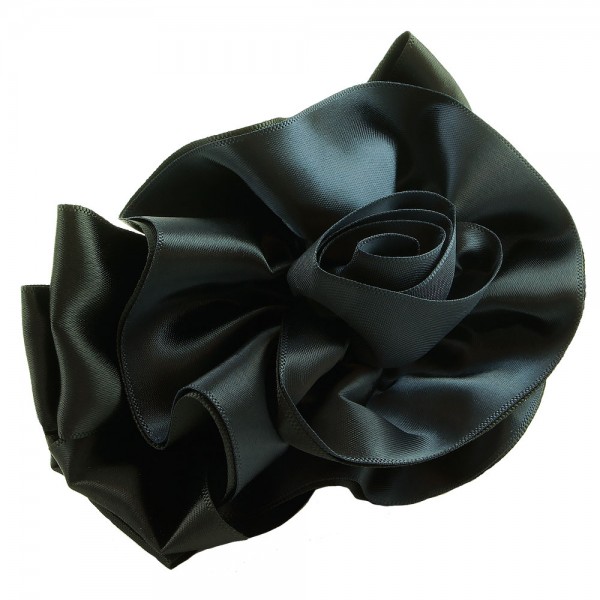 Handbunden ros av två lager polyestertyg med svart färg på utsidan. Stor ros som mäter 12 x 9 cm, med ett kraftigt hårspänne på undersidan som mäter 10 x 1 cm.