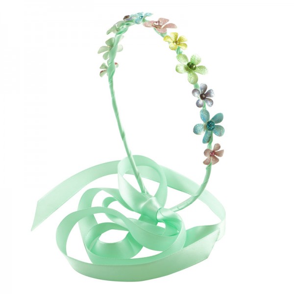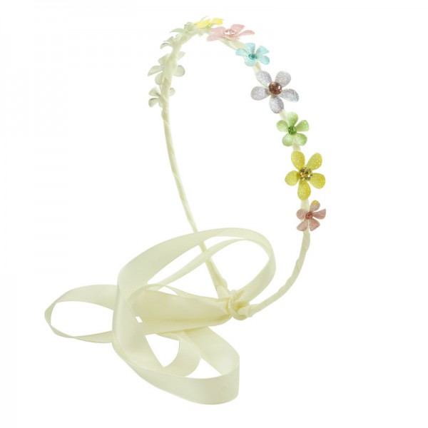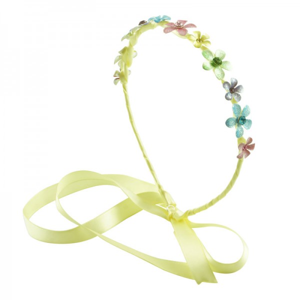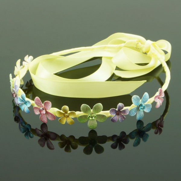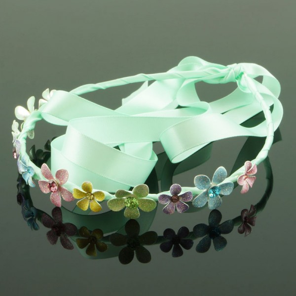 Metalldiadem inklätt i ett långt tyg som sticker ut ca 50 cm från diademändarna, tänkt att man ska kunna slå en knut bakom håret. Glittriga metallblommor på ovansidan med matchande strass sten i vardera blomma. Ett fint diadem av hög kvalitet som finns i färgerna: