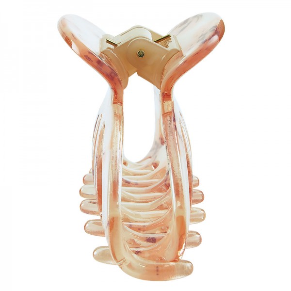 Snygg snäckformad hårklämma som förenar design och funktion. Gjord av blankpolerad akryl med vackra orkidéer inbakade i plasten. Inbakningen gör att blommorna är bättre skyddade från slitage till skillnad från hårklämmor där motiven är målade på ytan.