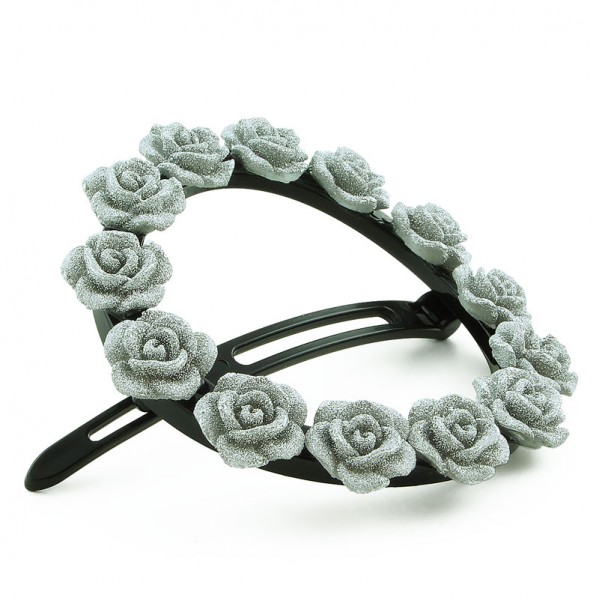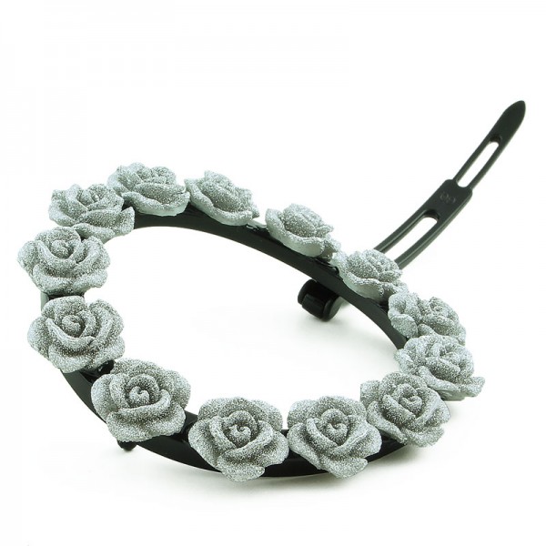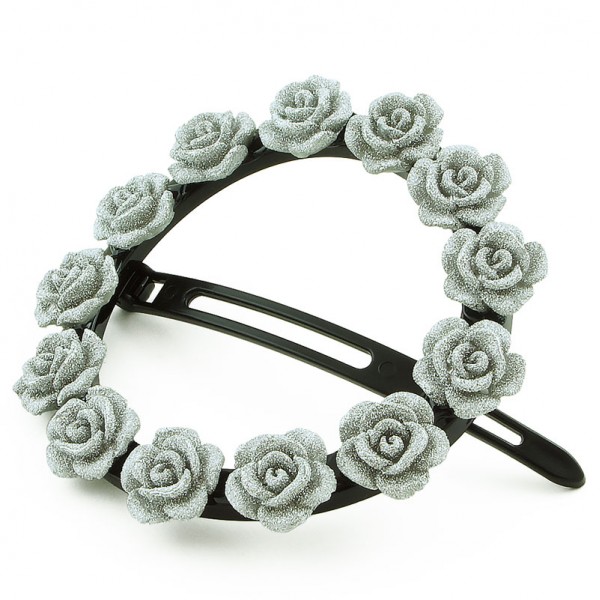 Vackert cirkelspänne för dig med långt hår, dekorerat med glittriga och silverfärgade rosor på ovansidan. En lätt och praktiskt accessoar som piffar upp vilket hår som helst.