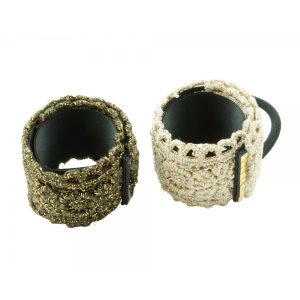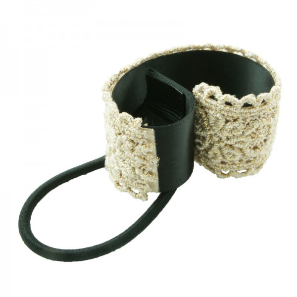 Hair cuffs i vintage stil med blommotiv och guldfärgade trådar som med gummisnodden på plats virar sig runt din hästsvans. Handtillverkad och av hög kvalitet. Finns med två olika färger för att passa just din hårfärg.