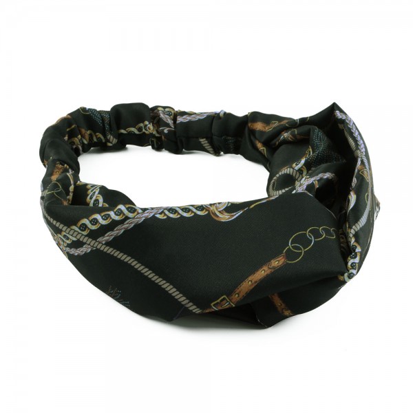 Glansigt och slätt hårband av satin som minskar risken för tovor och brutna hårstrån. Förutom att tyget är skonsamt mot håret så är det mönstrat med diverse accessoarer som förhöjer intrycket. Mäter 54 cm i omkrets med ett elastiskt resårband på baksidan.