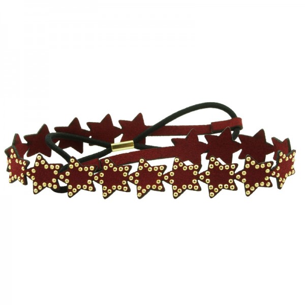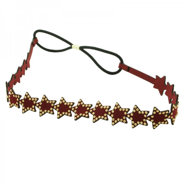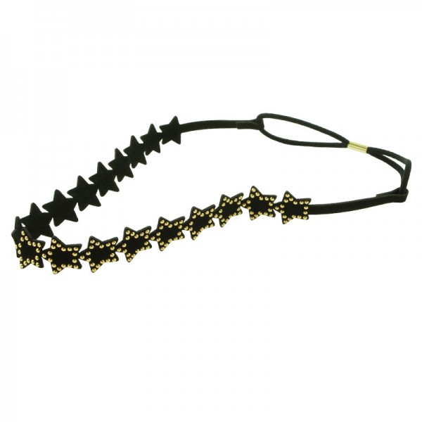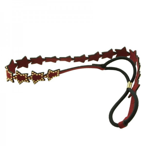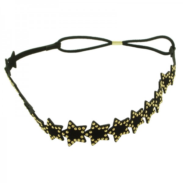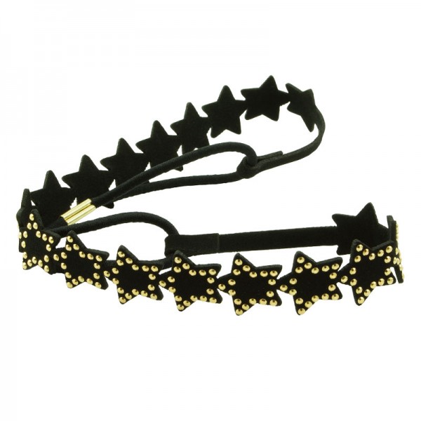 Smalt stjärnformat hårband av läderliknande polyester med guldfärgade nitar. Elastiskt nylonband baktill. Bra kvalitet med två olika färgalternativ: