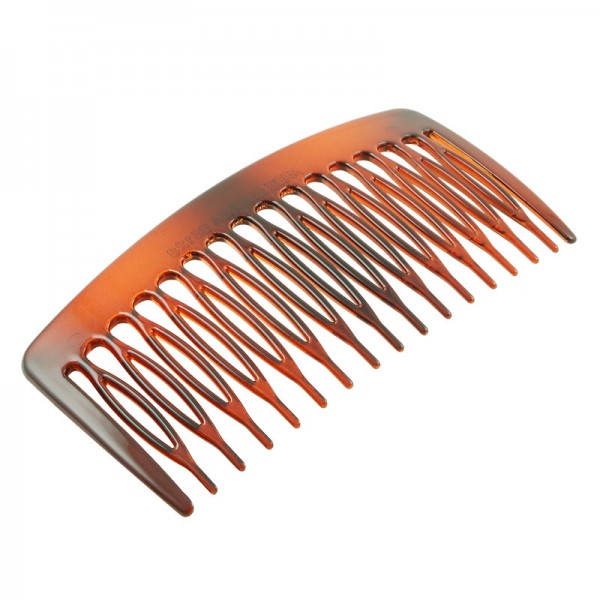 Hårkam med rak rygg och blank framsida. Baksidan är mattfärgad för bättre hårgrepp. Tänderna är dessutom ovala i mitten för att kammen ska sitta stabilare i håret.