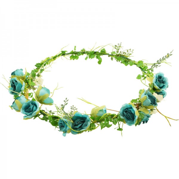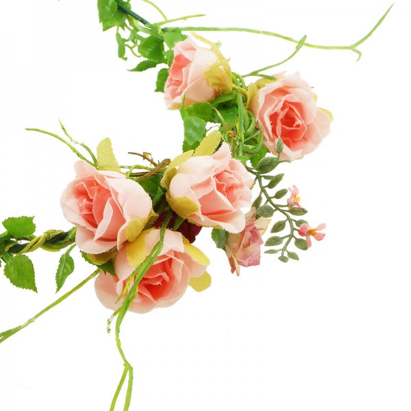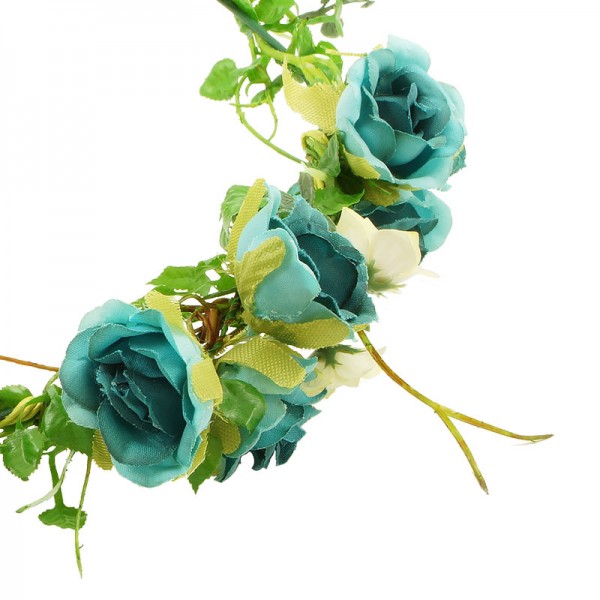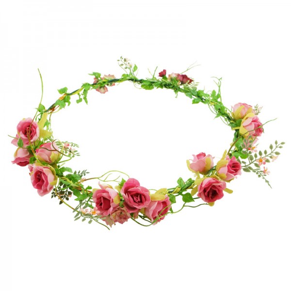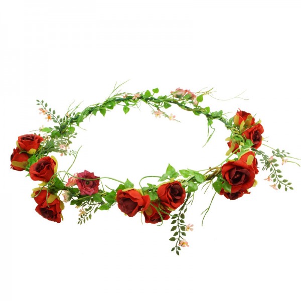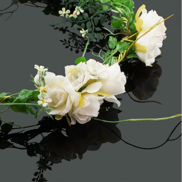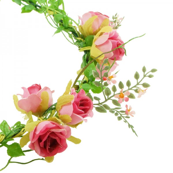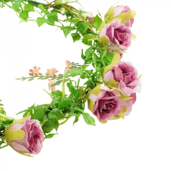 Handgjord blomsterkrans med små rosor med diameter på 2 cm, vackert dekorerade på framsidan och sidorna av kransen. Konstgjord men mycket vacker och realistiskt accessoar med kvalitet i varje detalj.