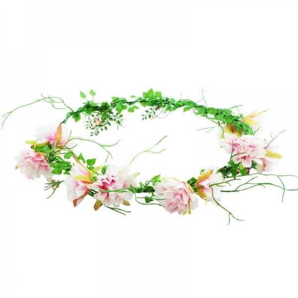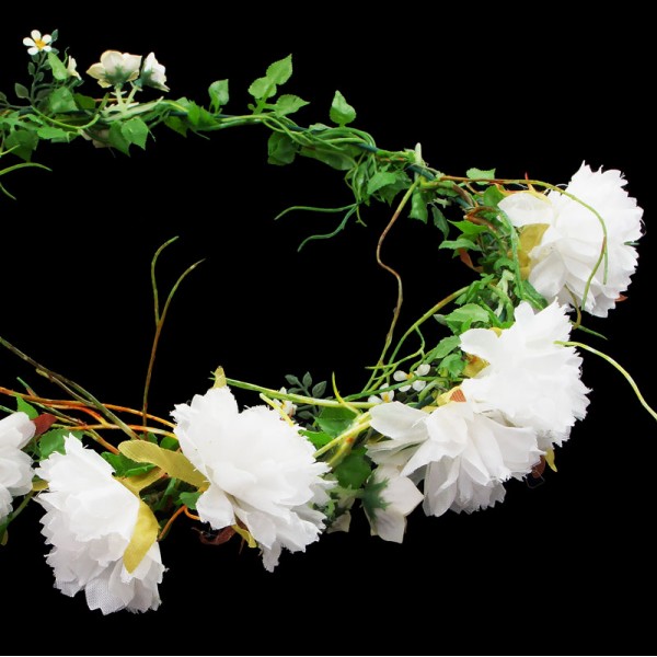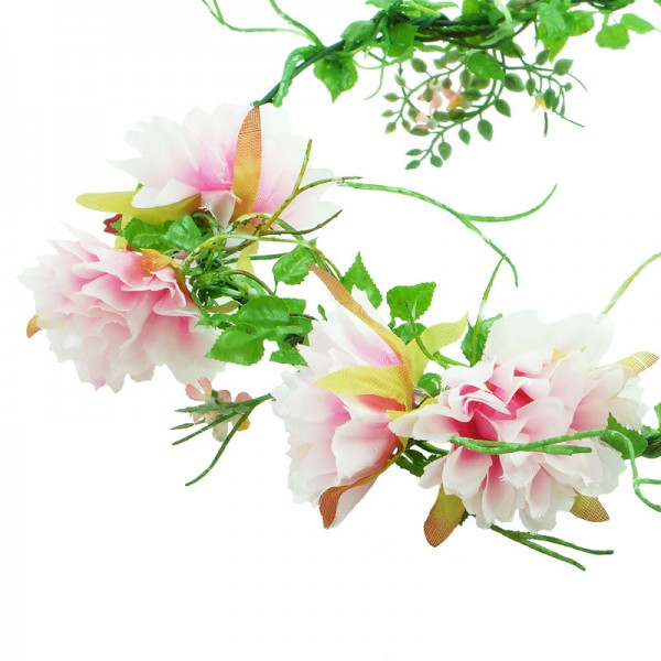 Blomsterkrans med 3 cm stora pioner på framsidan och på sidorna. Vackert bunden krans med utstickande blad som får den att framstå som mera naturlig. Hög kvalitet rakt igenom, både vad gäller material och utförande (handgjord).