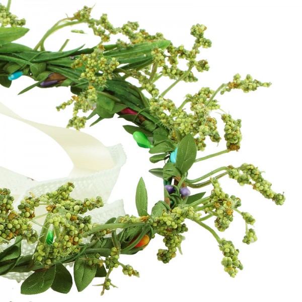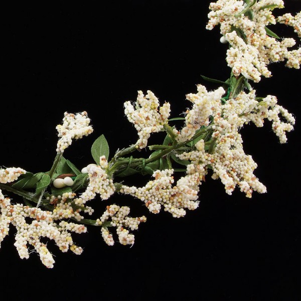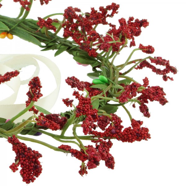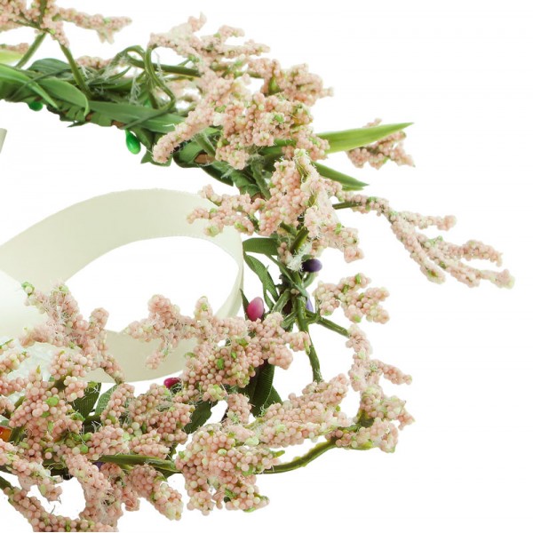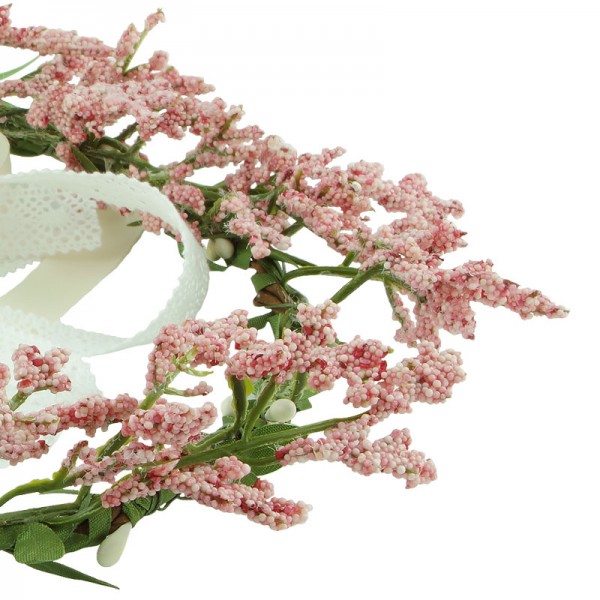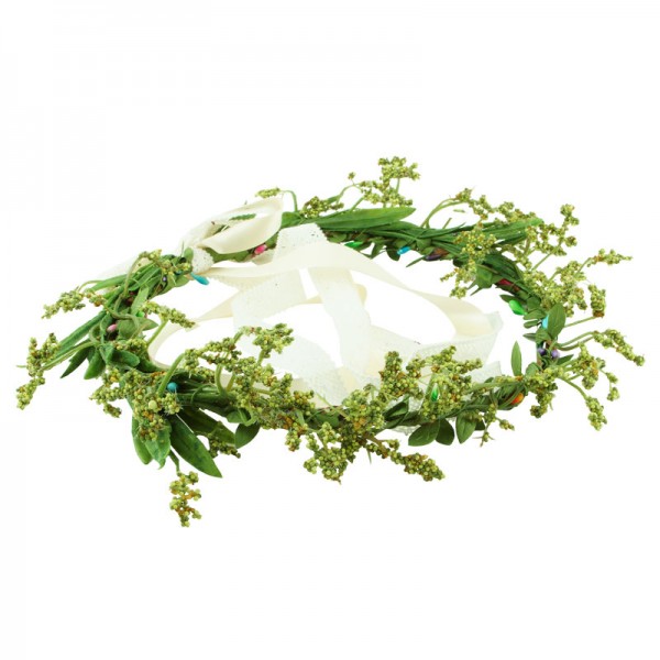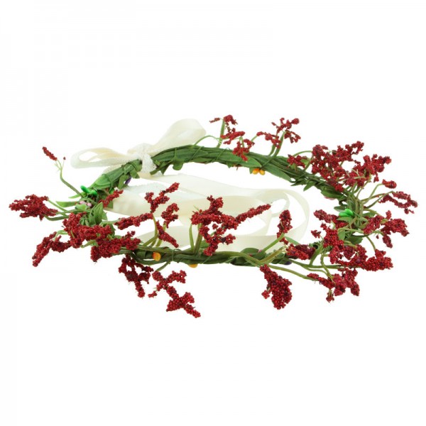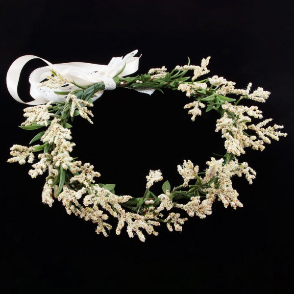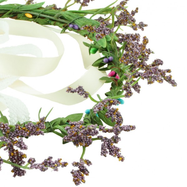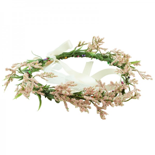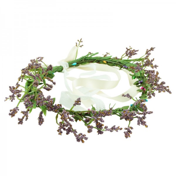 Vacker hårkrans i annorlunda snitt med utstickande vildblommor runtom. Blommans form påminner om ljungblomman med skillnaden att vår vildblomma ser lite mer "bärig" ut. På baksidan sitter en rosett av spets- och silkesband som mäter 38 cm i längd.