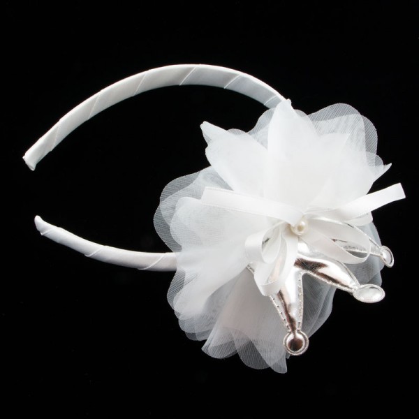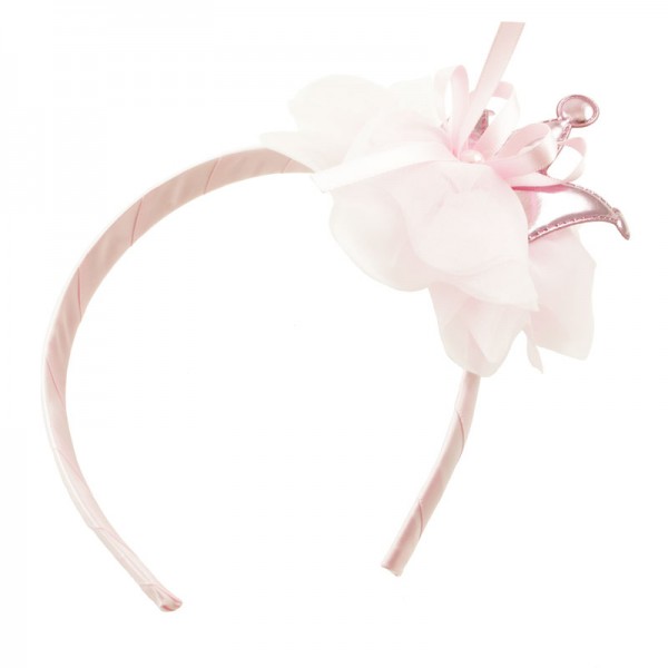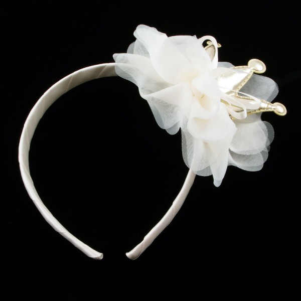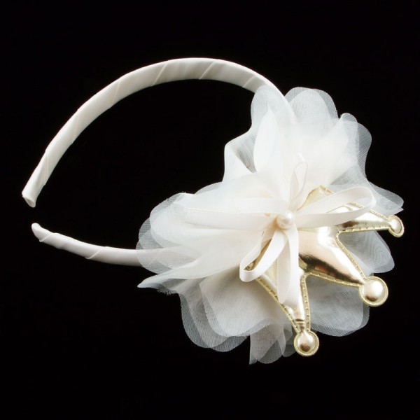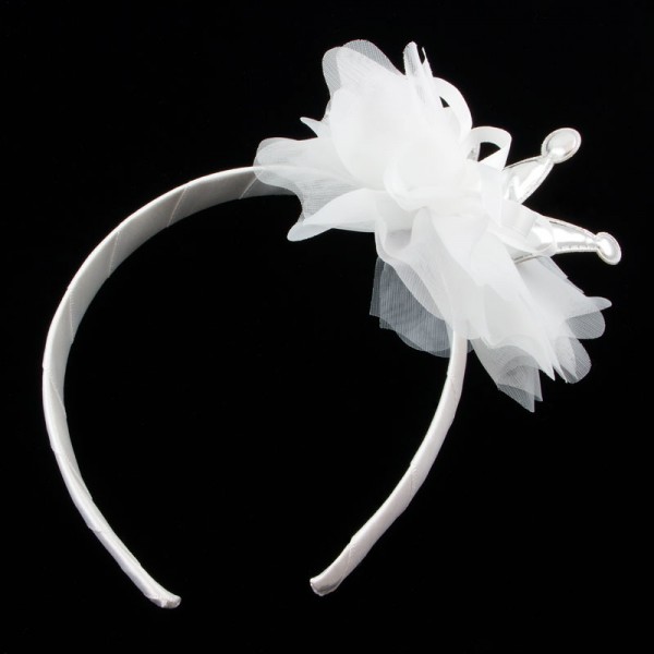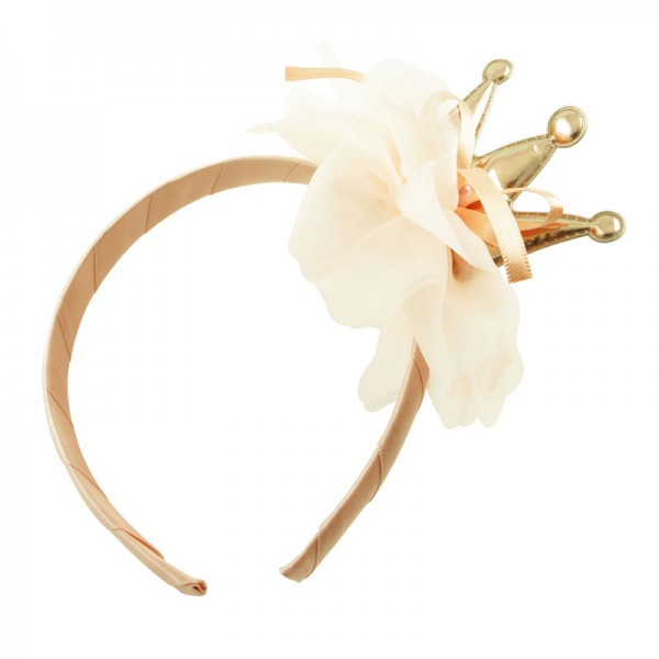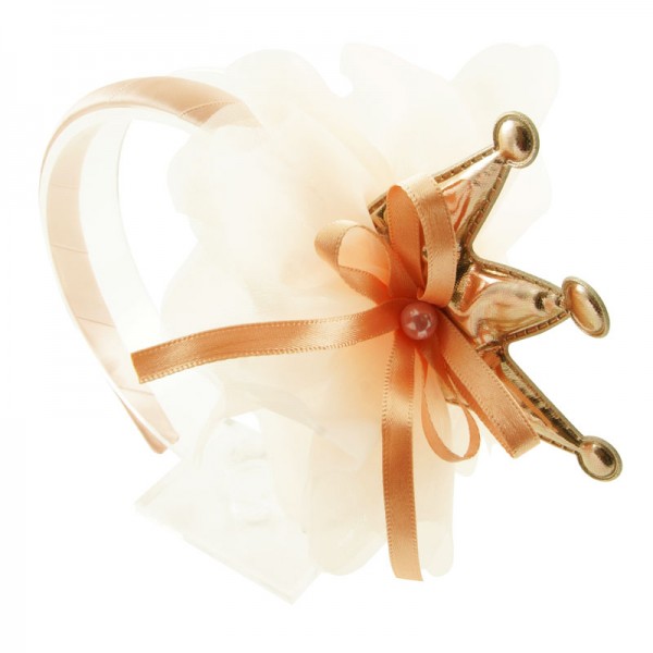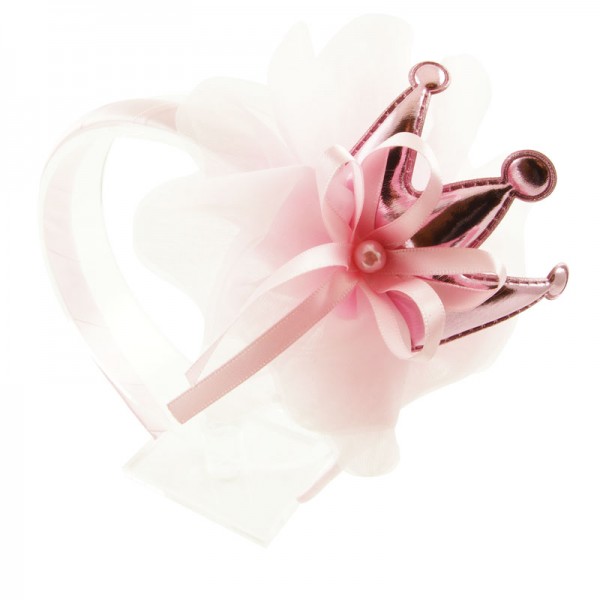Klädsamt barndiadem med en mjuk krona på snedden. Kronan mäter 7 cm i bredd och 6 cm i höjd och har en rosett med liten vit pärla i mitten. Tygnätet undertill mäter ca 12 cm i diameter. Rolig och uppskattad accessoar som förgyller alla tillfällen.