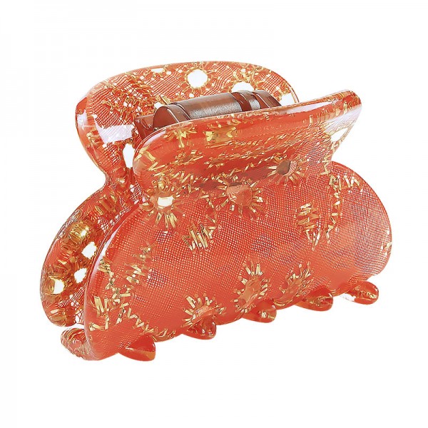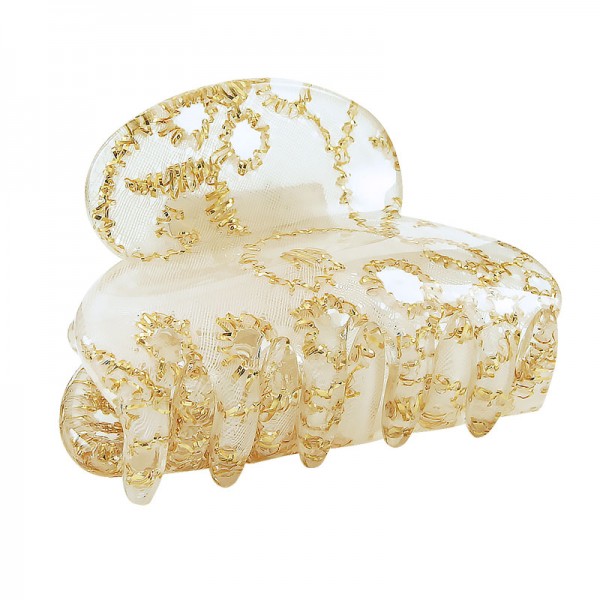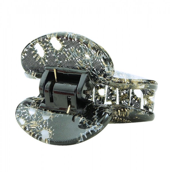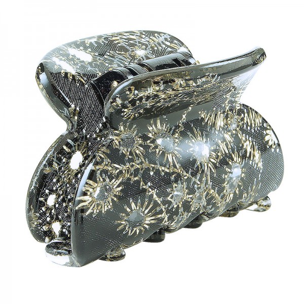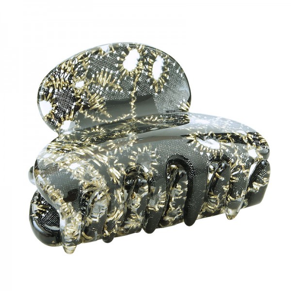 Handgjord hårklämma av tålig akryl med blankpolerad yta. Mönstrad med tunnfärgade fibertrådar och guldstygn; vackra detaljer som definitivt gör denna hårklämma unik. Riktig kvalitetsaccessoar med hög finish.