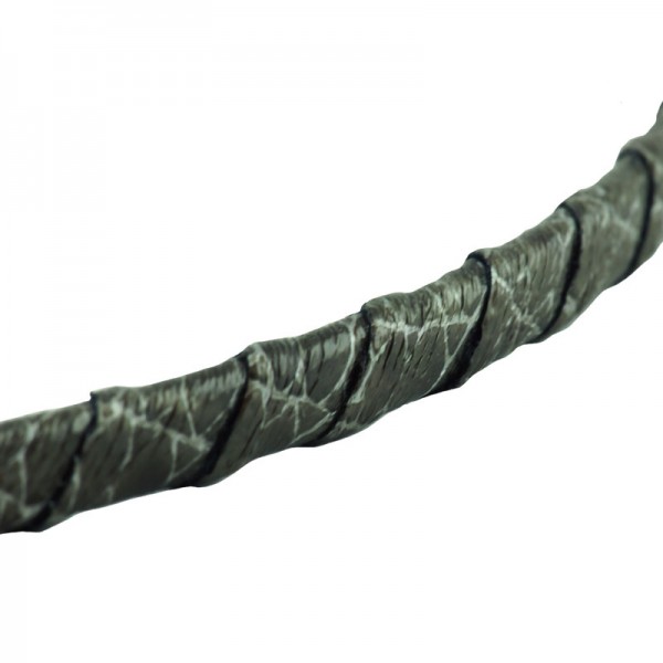 Tunt 4,5 mm brett ståldiadem inlindat i mönstrat konstskinn (polyuretan). Lagom tyngd som gör att den inte känns för tung på huvudet samtidigt som den känns dyr och gedigen.