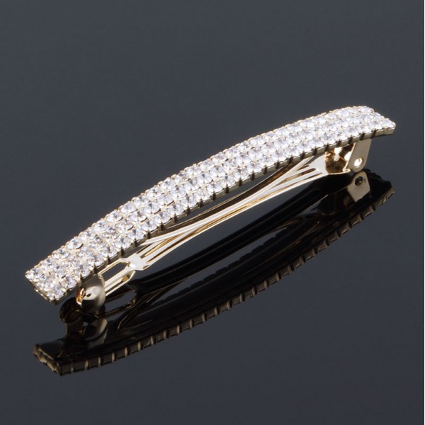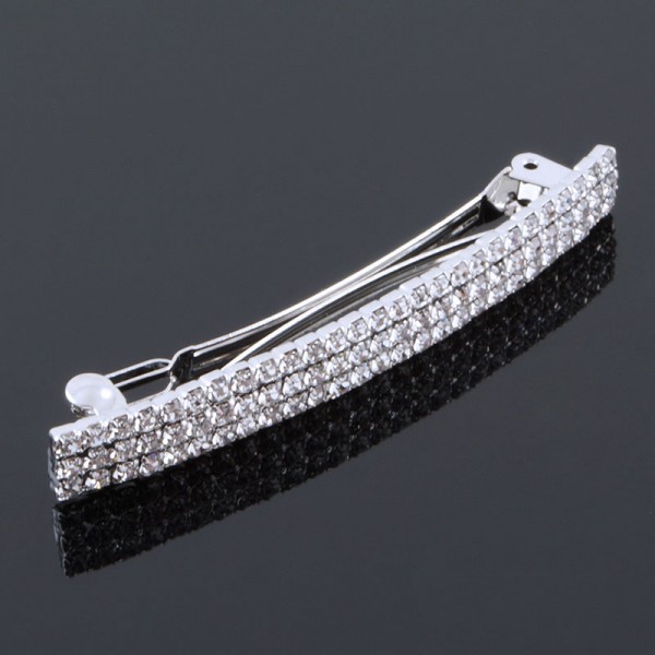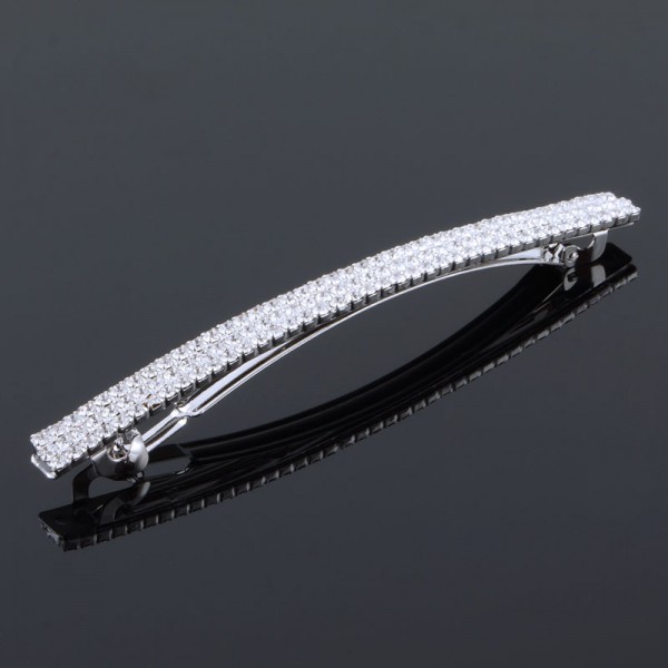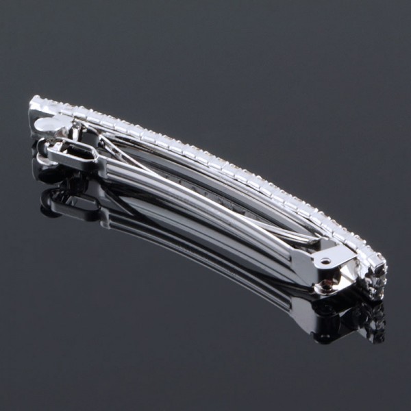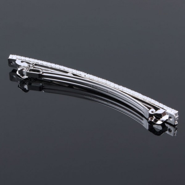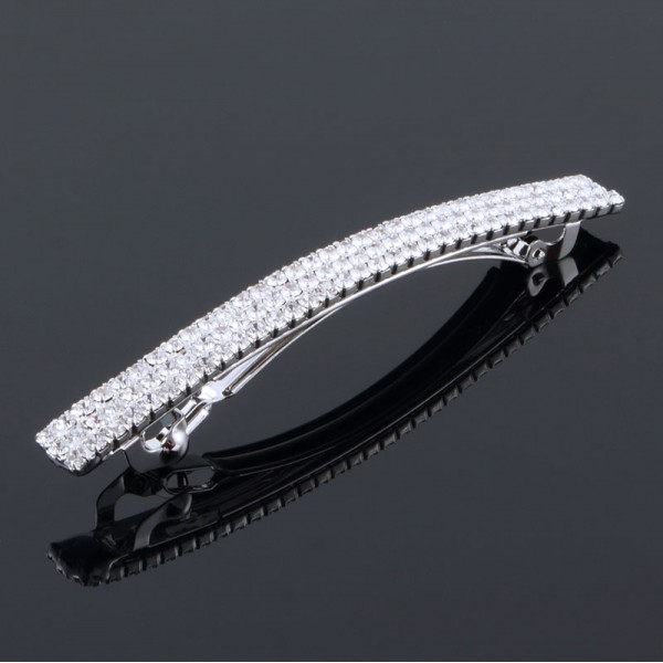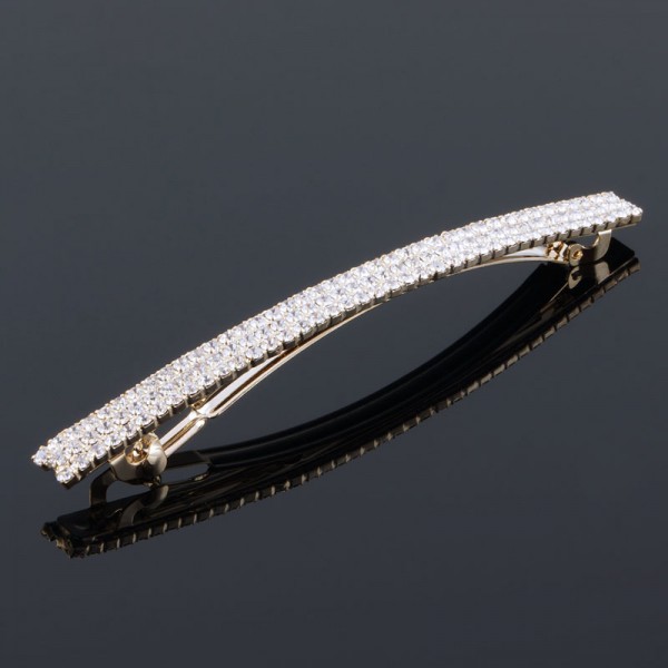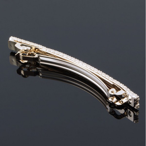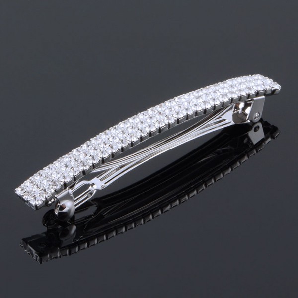 Elegant metallspänne med tre rader av vita strasstenar på ovansidan. Hög kvalitet och nickelsäker. Finns i färgerna silver eller guld med följande storlekar: