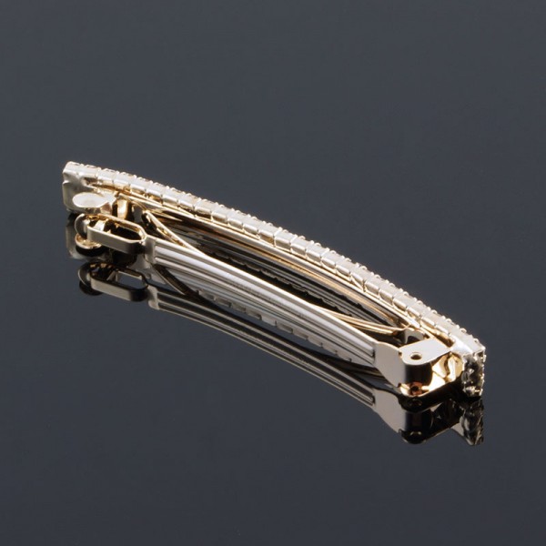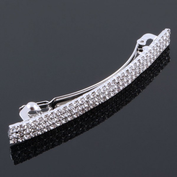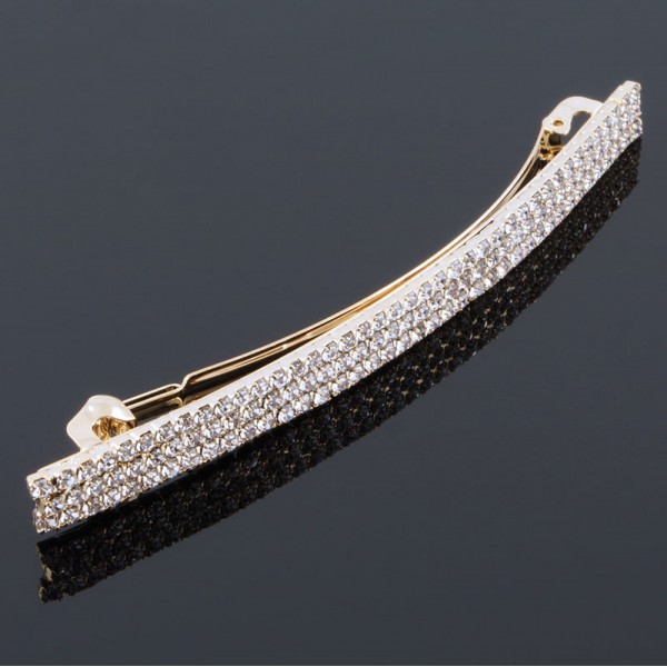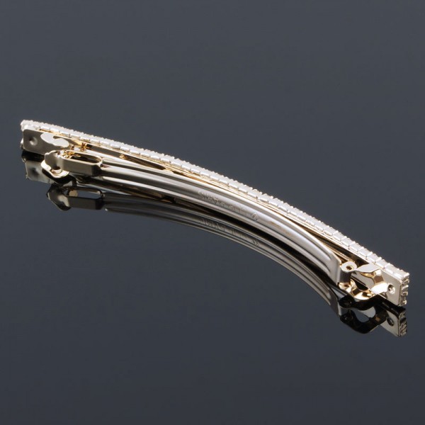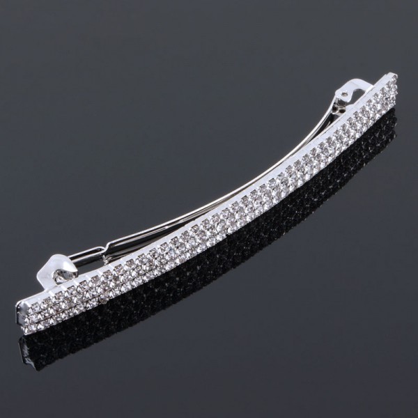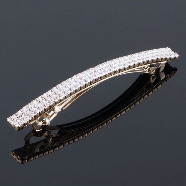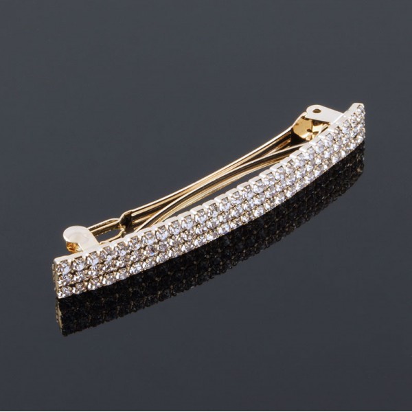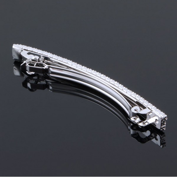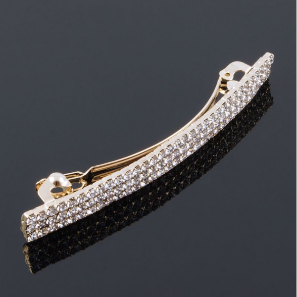 Elegant metallspänne med tre rader av vita strasstenar på ovansidan. Hög kvalitet och nickelsäker. Finns i färgerna silver eller guld med följande storlekar: