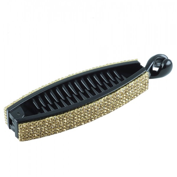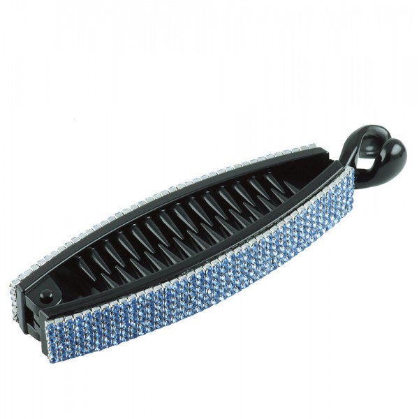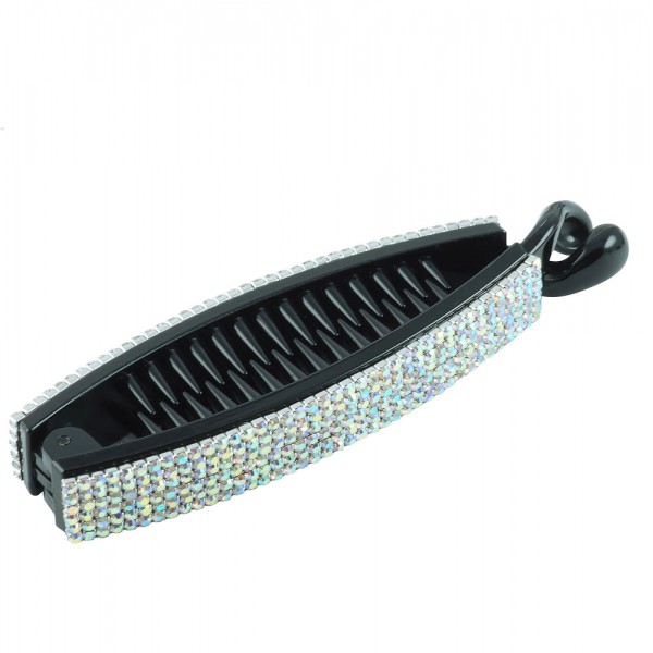 Stor bananklämma med vackra och dekorativa strasstenar på båda sidorna. Perfekt för den som gillar glittriga håraccessoarer. Passar medellångt till långt hår och finns med följande färger: